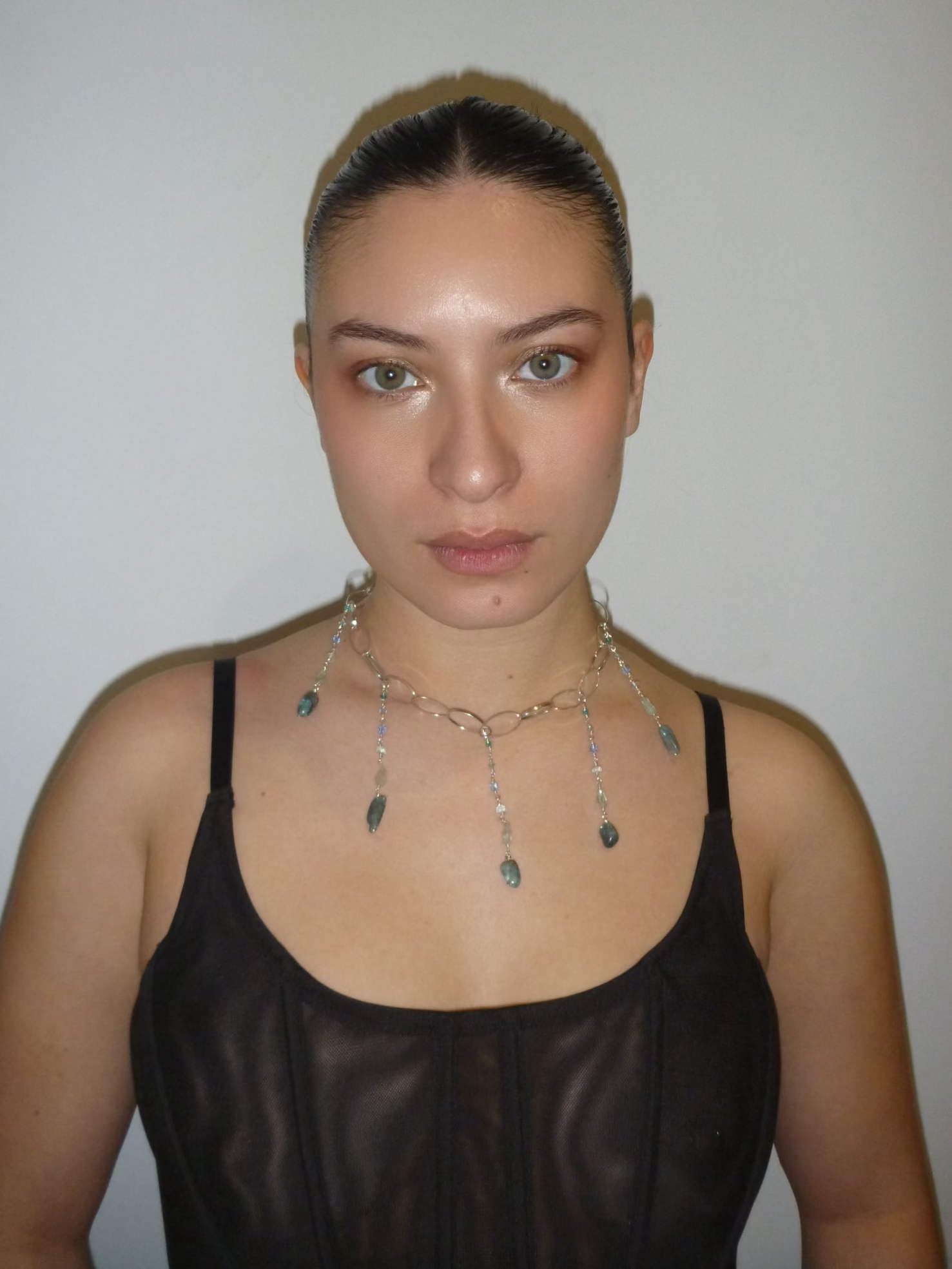 Le collier constitue la continuité et l’aboutissement de la cascade qui se déploie sur le corps, depuis la tête jusqu’au torse. Utilisant l’aigue-marine, les perles de verre et le jade présents dans les autres pièces, il complète l’ensemble en formant une seule et grande cascade. Le jade symbolise l’eau s’écrasant sur un amas de pierres rugueuses, représenté par les grandes gemmes d’apatite.