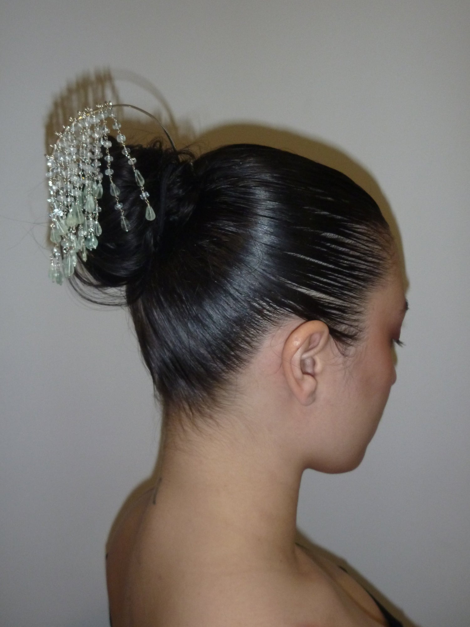 Pensée pour émerveiller, cette coiffe se porte avec des coiffures spécifiques qui la mettent en valeur. Fixée sans contraindre les cheveux, elle se distingue comme un ornement d’exception, évoquant le jaillissement d’une cascade naissante. Les pierres de jade et d’aigue-marine, liées entre elles par un délicat travail de bouclage, conservent une forme brute et imparfaite, rappelant les galets tendres façonnés par l’eau vive au fil des décennies.