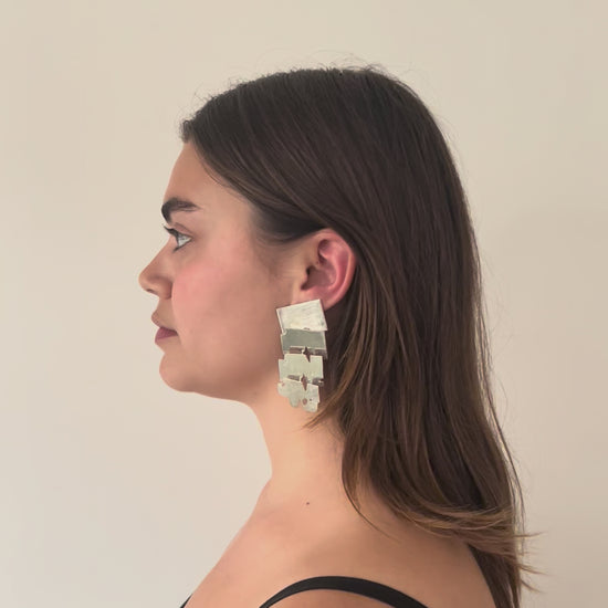 Ces boucles d’oreilles présentent des plaques rectangulaires qui évoluent progressivement d’une surface parfaitement polie à une finition richement texturée et usée. Cette métamorphose symbolise la nature changeante des objets, reflétant le passage du temps.